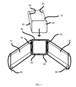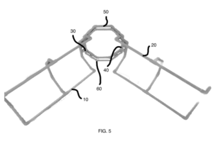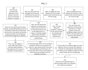 7. Next, the user places the apparatus on the ground, and ensures that the first air dam panel and second air dam panel form a Y-shape, or similarly angled shape which will funnel debris towards and into the central frame. (260)